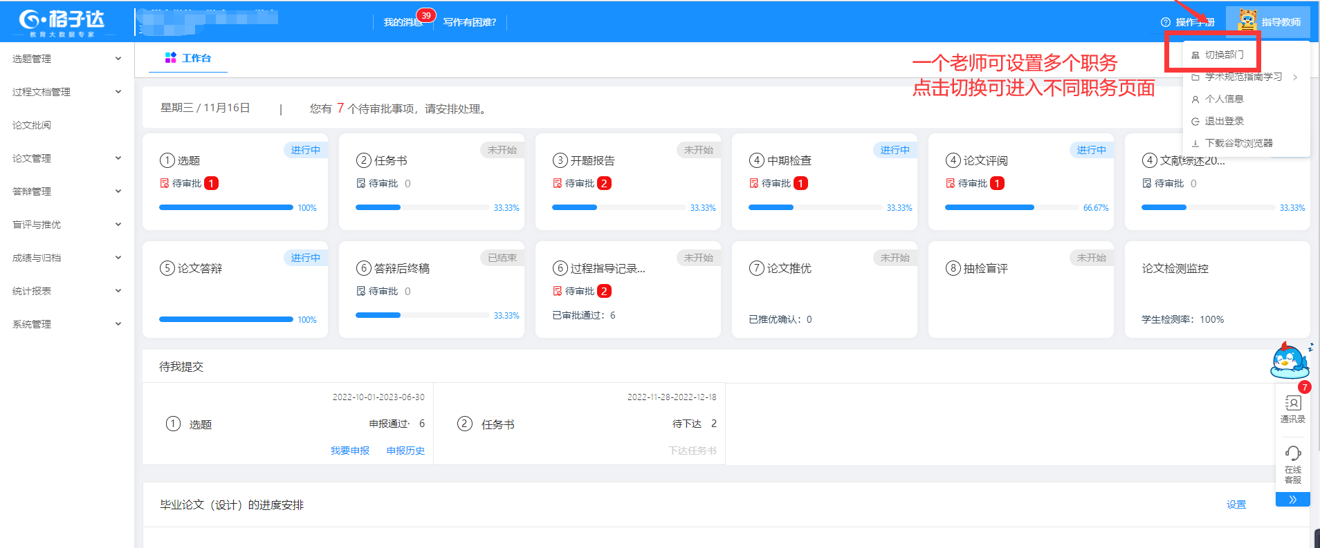 在【工作台】界面,可查看所有过程文档审批情况点击环节可打开毕设论文环节概况报表。