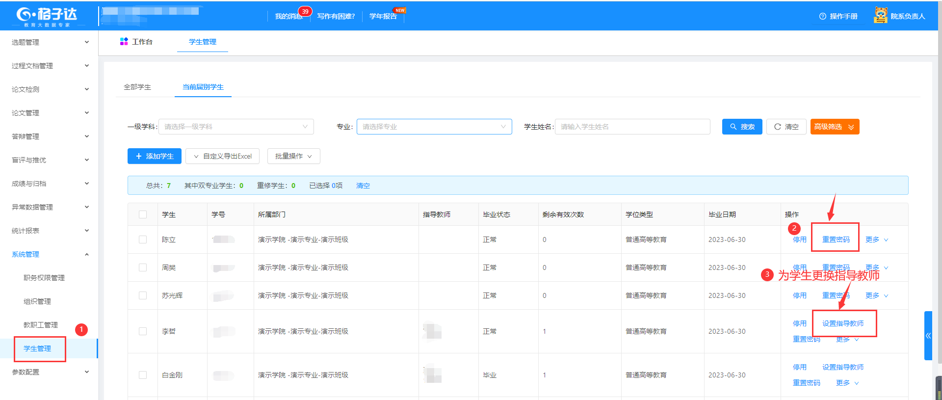 师生双选课题:展示学院所有已经确定师生关系并通过审核的课题,授权修改课题。