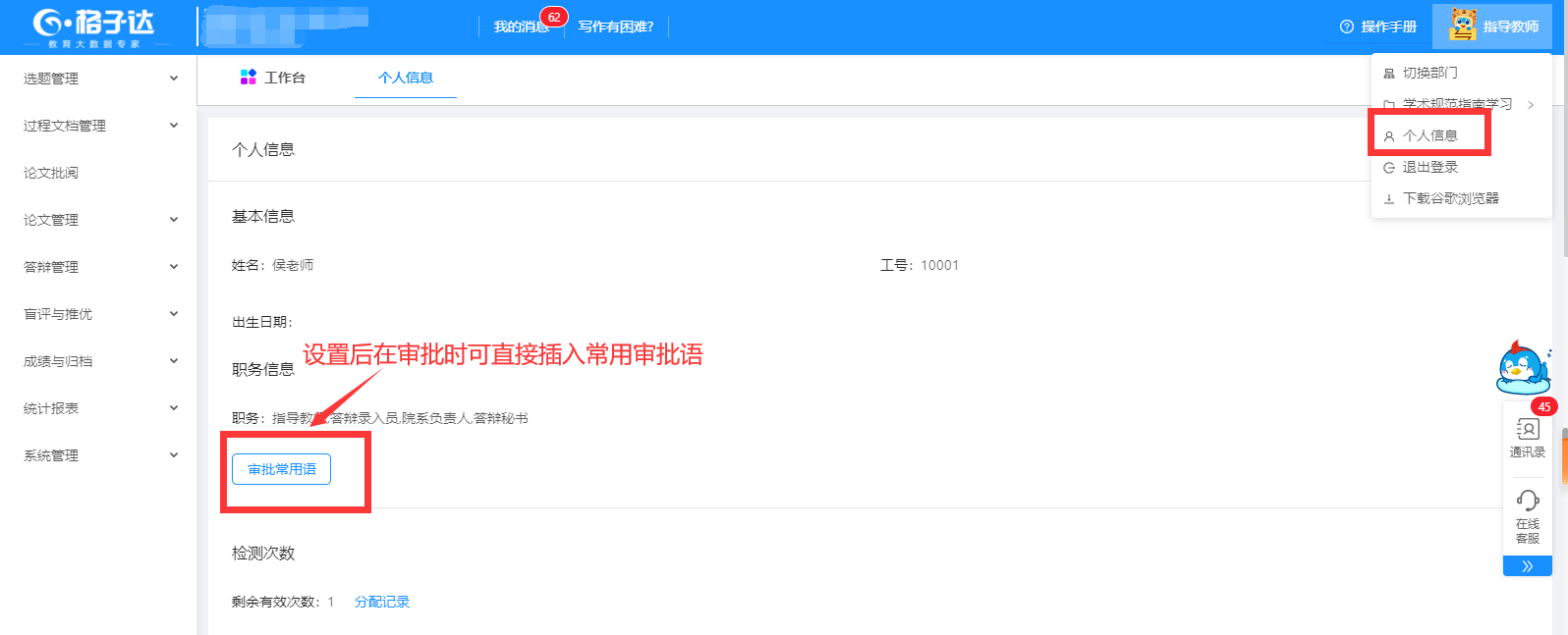 过程文档管理管理中可查看各学生具体的情况,对其进行监督管理并对其进行赋权赋权一次即可修改一次。