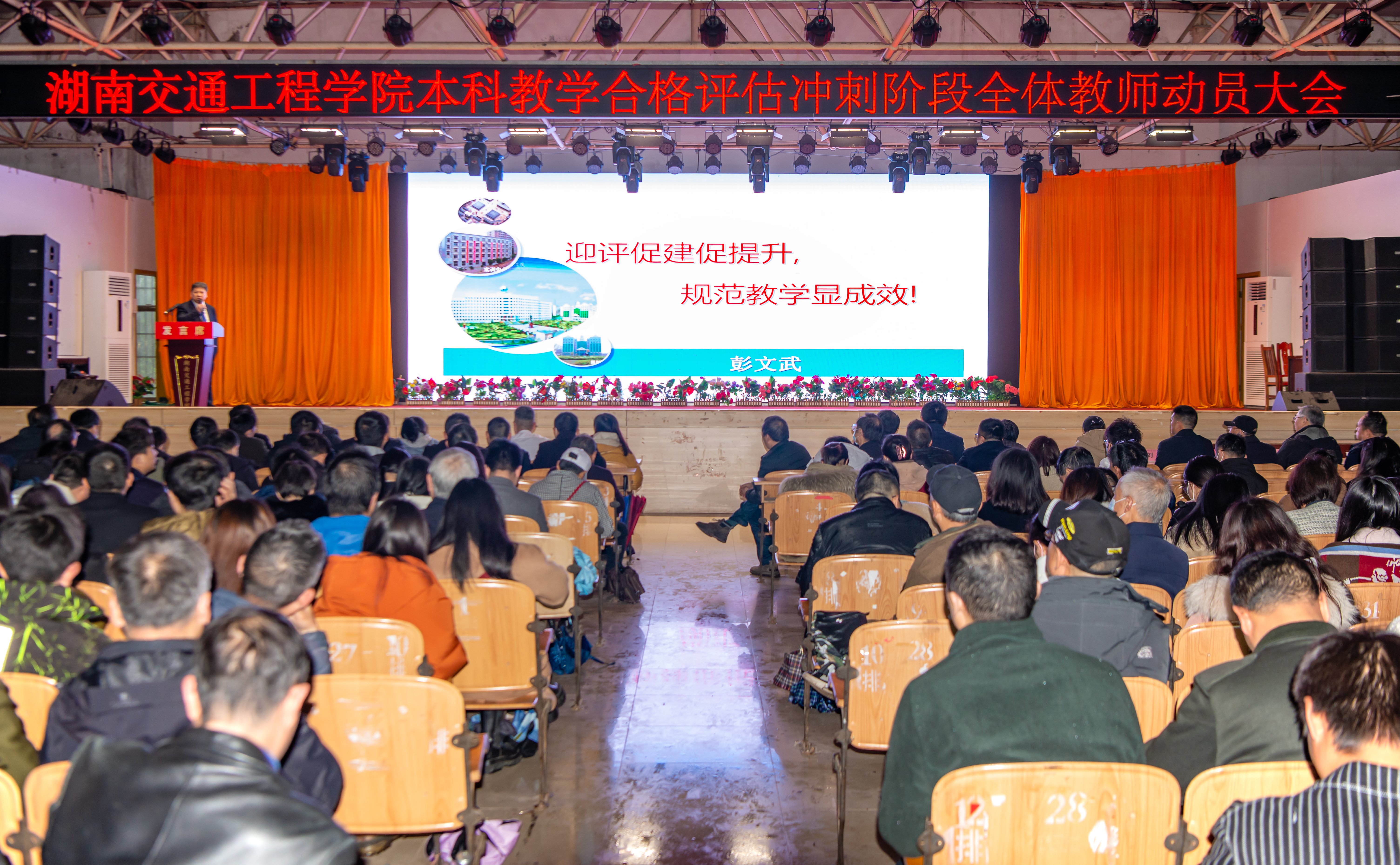 本网讯(记者 赵红深 摄影 奉隆源)3月23日下午,学校在大学生活动中心召开本科教学合格评估冲刺阶段全体教师动员大会,通报和分析自评阶段专家组成员对bevictor伟德迎评工作的建议和意见,并对冲刺阶段的迎评工作进行全面部署。全体校领导、全体教师,各职能处室负责人、各二级学院(部)党政负责人参加会议。执行校长刘杰主持。