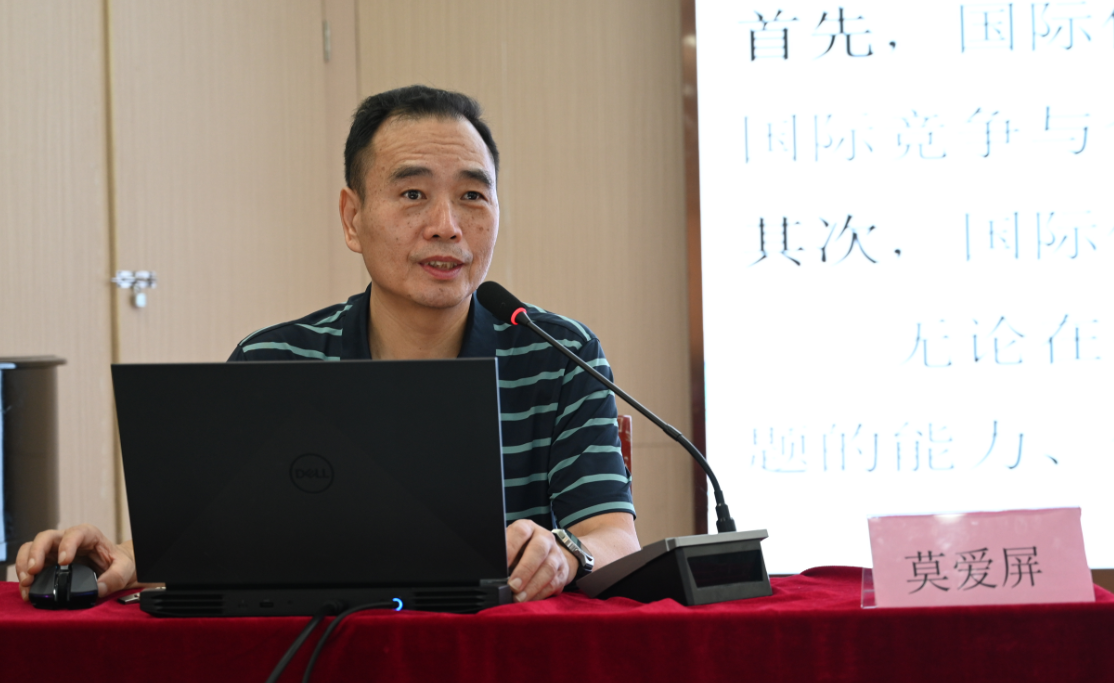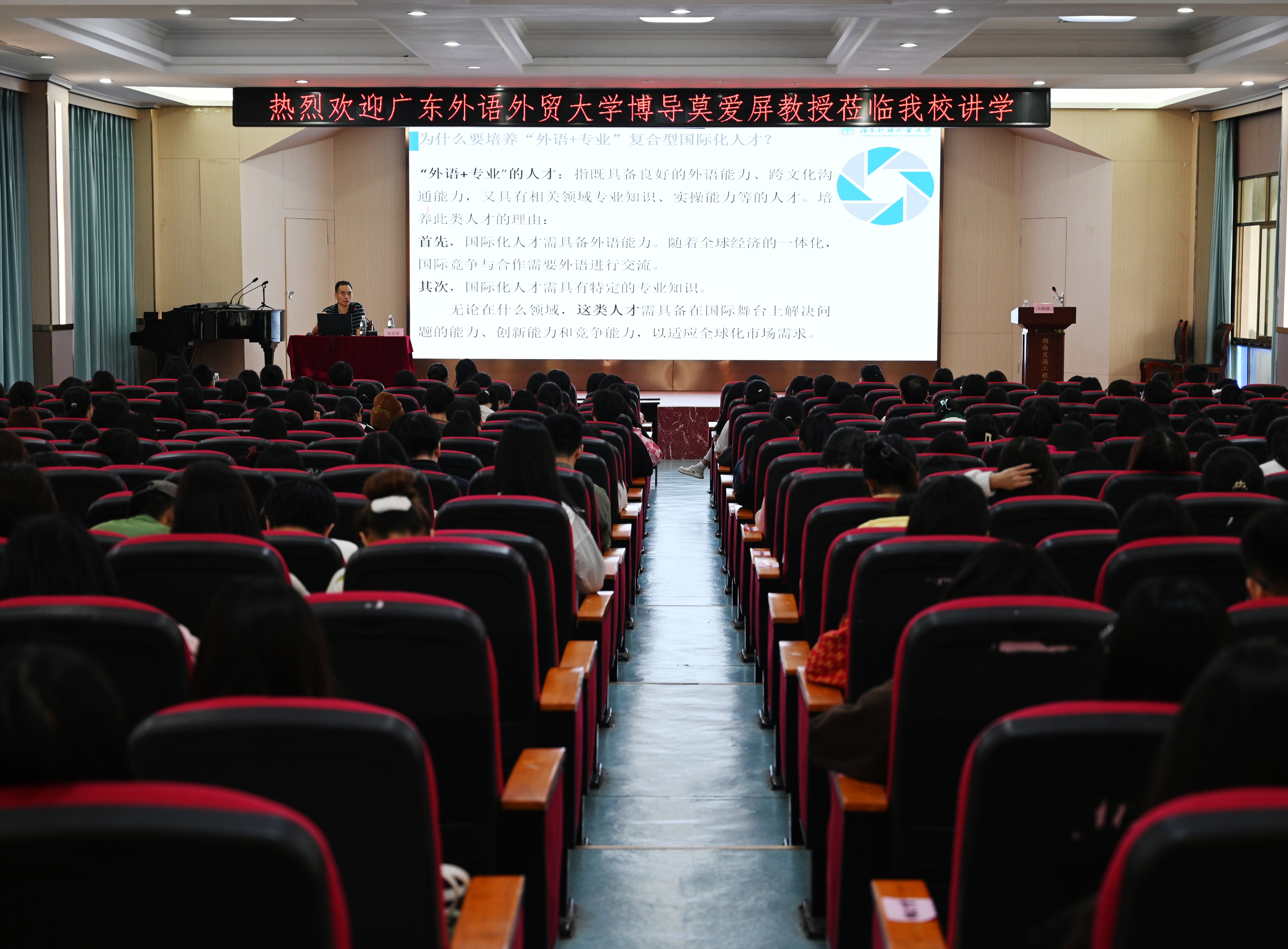 莫爱屏通过通俗易懂的语言、丰富前沿的案例和个人工作生活体验,从什么是“外语+专业”复合型人才、为什么要成为“外语+专业”复合型人才、“外语+专业”复合型国家化人才培养的问题与对策、如何成为“外语+专业”复合型国际化人才、“外语+专业”复合型国家化人才面临的机遇与挑战等方面进行了阐释,并与同学们深入探讨“外语+专业”复合型人才的必要性,迫切性和可行性。他指出,英语专业学生要尽快搭上数字化人文快车,学习数字化技能、提升跨文化沟通能力、掌握多语言能力,积极参与国际实习或交流项目,持续学习和自我提升。同时,莫爱屏鼓励同学们要努力学好外语及专业知识和技能,提高自身核心竞争力,成为具有国际化视野,跨文化交流能力,创新能力和创新精神的“外语+专业”复合型、应用型人才。