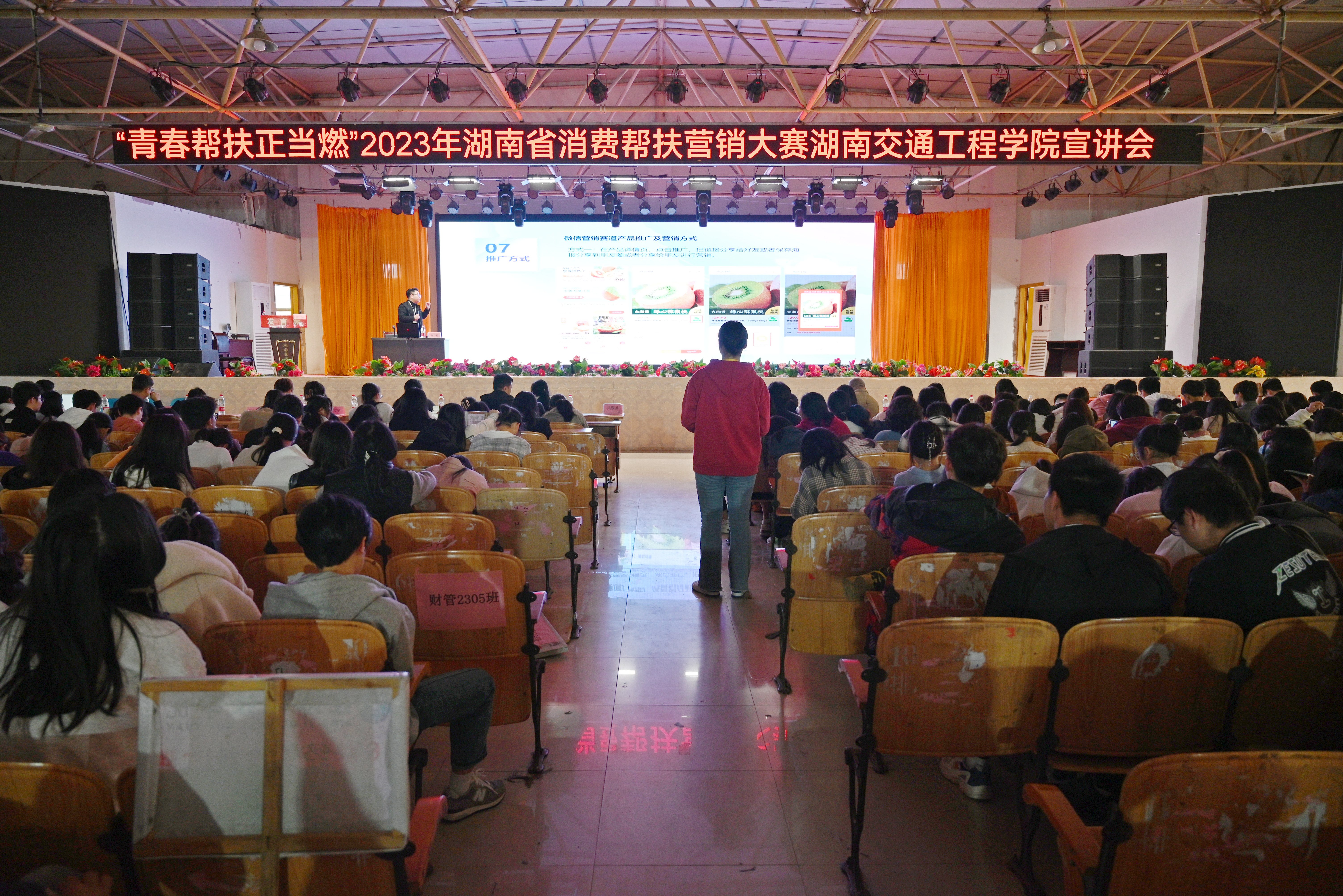 本网讯(通讯员 摄影 赵红深)消费帮扶是巩固拓展脱贫攻坚成果的重要举措。为拓宽bevictor伟德学生的视野和思路,激发其创新思维和创新能力,提升营销技能,把学生培养成为适应市场需求的实用型人才,11月23日下午,学校在大学生活动中心举办“青春帮扶正当燃”湖南省2023年消费帮扶营销大赛宣讲会。省消费帮扶营销活动组委会对外联络部主任杨凌、微信赛道负责人周露莅临现场指导;经济管理学院院长朱忠祥、副院长王冰,党总支书记赵荣华、副书记李燕丽,学校党委宣传部等相关职能部门负责人、各二级学院党总支副书记出席会议;各二级学院大赛指导老师、经济管理学院学生干事、全体辅导员和在校学生参加宣讲会。王冰主持。