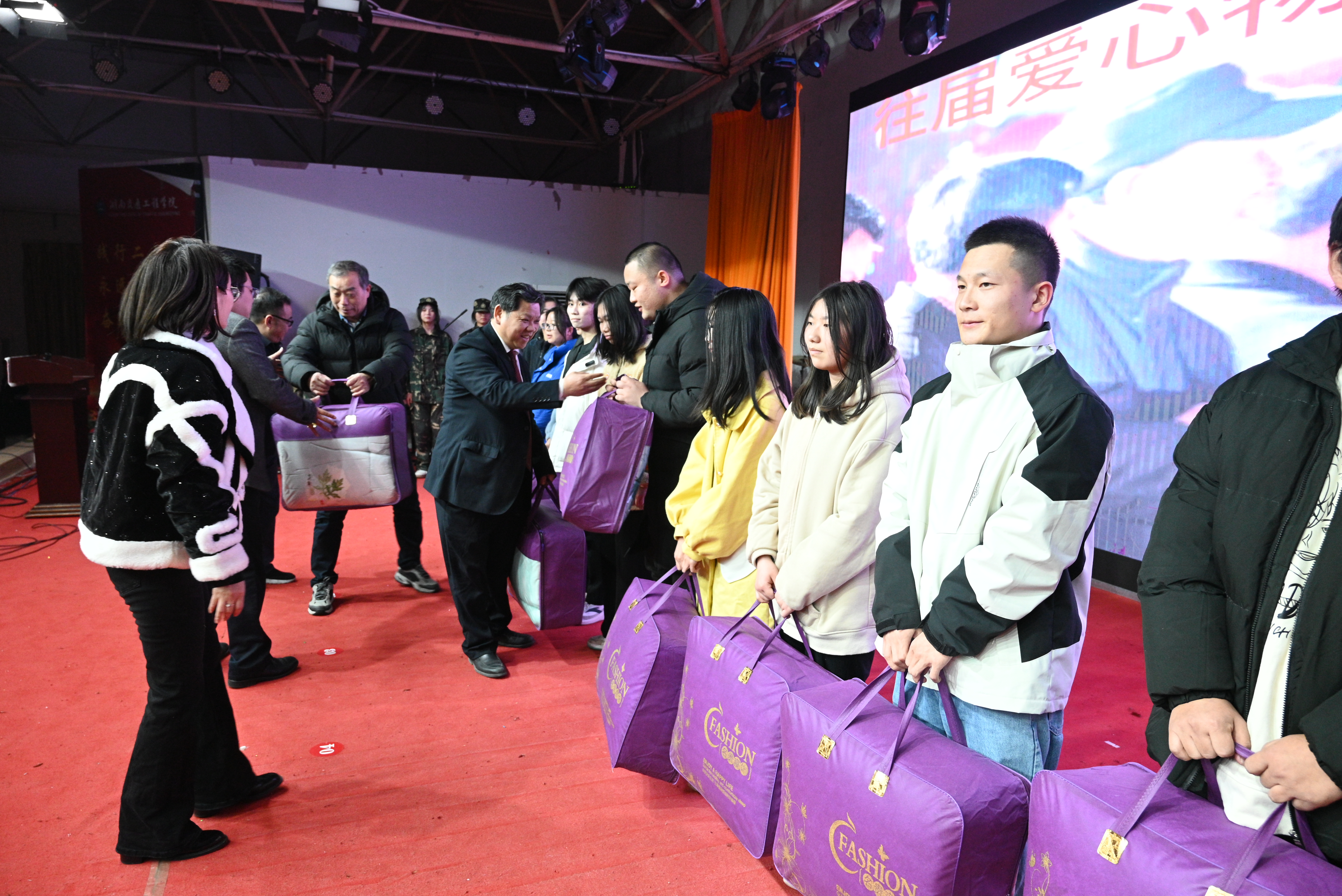 本网讯(通讯员 摄影 赵红深)冬月过半,寒气袭人。为了确保bevictor伟德贫困学子温暖过冬,12月28日晚7时,学校在大学生活动中心举行董事长刘福生第33次给贫困学生资助御寒爱心物品仪式,给1279名家庭生活困难品学兼优的学生资助御寒爱心物品。党委书记刘文君,副董事长、执行校长刘杰,名誉校长刘平娥、党委副书记冯良贵,常务副校长彭文武,副校长余孟辉、刘义伦,校董事董晔卉等领导出席仪式并亲自参加棉衣棉被的发放。学生工作处,校团委等处室负责人、各二级学院党总支书记、全校辅导员,全体受助学生参加活动。