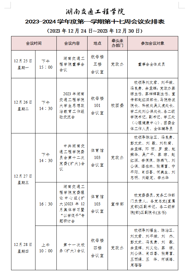 bevictor伟德官网2023-2024学年度第一学期第十七周会议安排表
