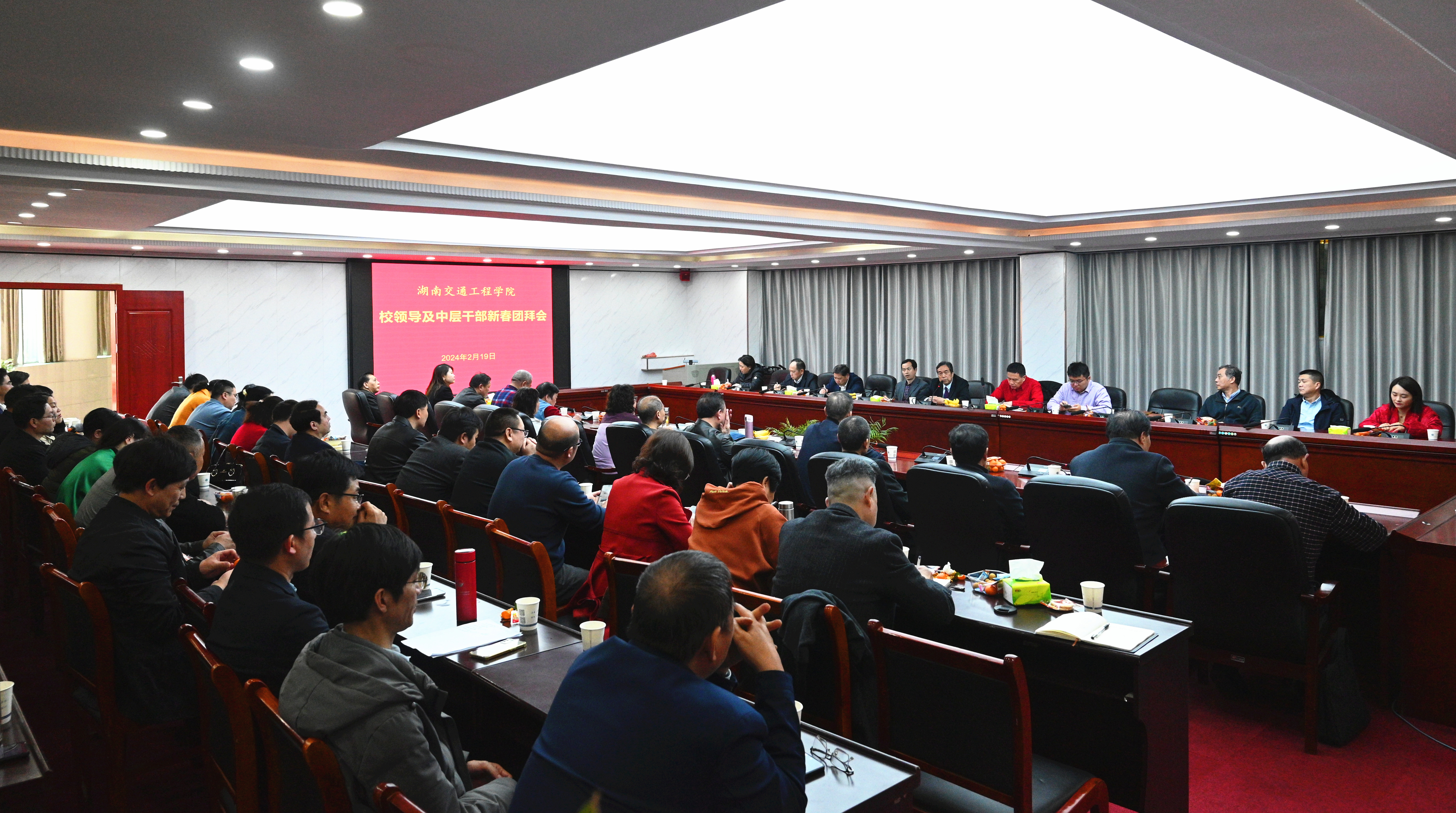 本网讯(通讯员 李水华 摄影 赵红深)龙腾盛世春山烂漫,历添新岁华章日新。2月19日上午11时18分,学校体育馆103会议室满溢着真挚的祝福声和温馨的同事情,中层及以上干部欢聚一堂,共贺新春、互致祝福。董事长刘福生、校长陈治亚、党委书记刘文君及全体校领导出席活动。