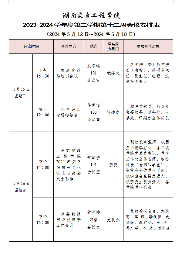 bevictor伟德官网2023-2024学年度第二学期第十二周会议安排表