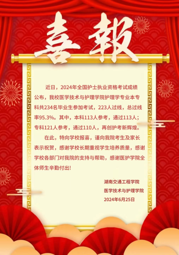 本网讯(通讯员 赵红深 邓丽)近日,2024年全国护士执业资格考试成绩揭晓,bevictor伟德医护学院护理学专业本专科共234名毕业生参加考试,223人过线,总过线率95.3%。其中,本科113人参考全部过线,过线率100%;专科121人参考,110人过线,过线率90.9%。创造了bevictor伟德护士执业资格考试通过率连续8年保持历史高位的优异成绩。