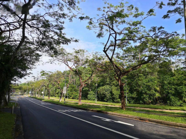 无论是在教学区,行政区,还是生活区,走在路上总能让人感受到无限绿意。校道两旁有高大且枝叶繁茂的热带乔木,下面是重重叠叠的棕榈科植物。每一寸空地上都种有草地,更有趣的是校园中鸟在脚下走,与人同享一片蓝天。
