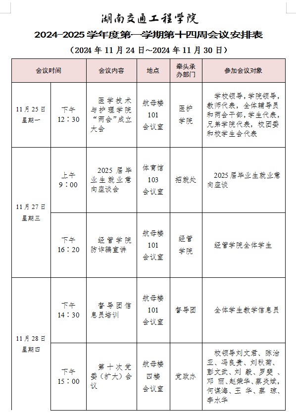 bevictor伟德官网2024-2025学年度第一学期第十四周会议安排表