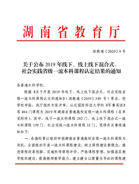 根据湖南省教育厅《关于开展2019年线下、线上线下混合式、社会实践省级一流本科课程认定的通知》(湘教通〔2019349),交通运输工程学院积极响应,经先期建设并申报,我院申请的《材料力学》认定为省级线下一流本科课程(湘教通〔20209 号)。