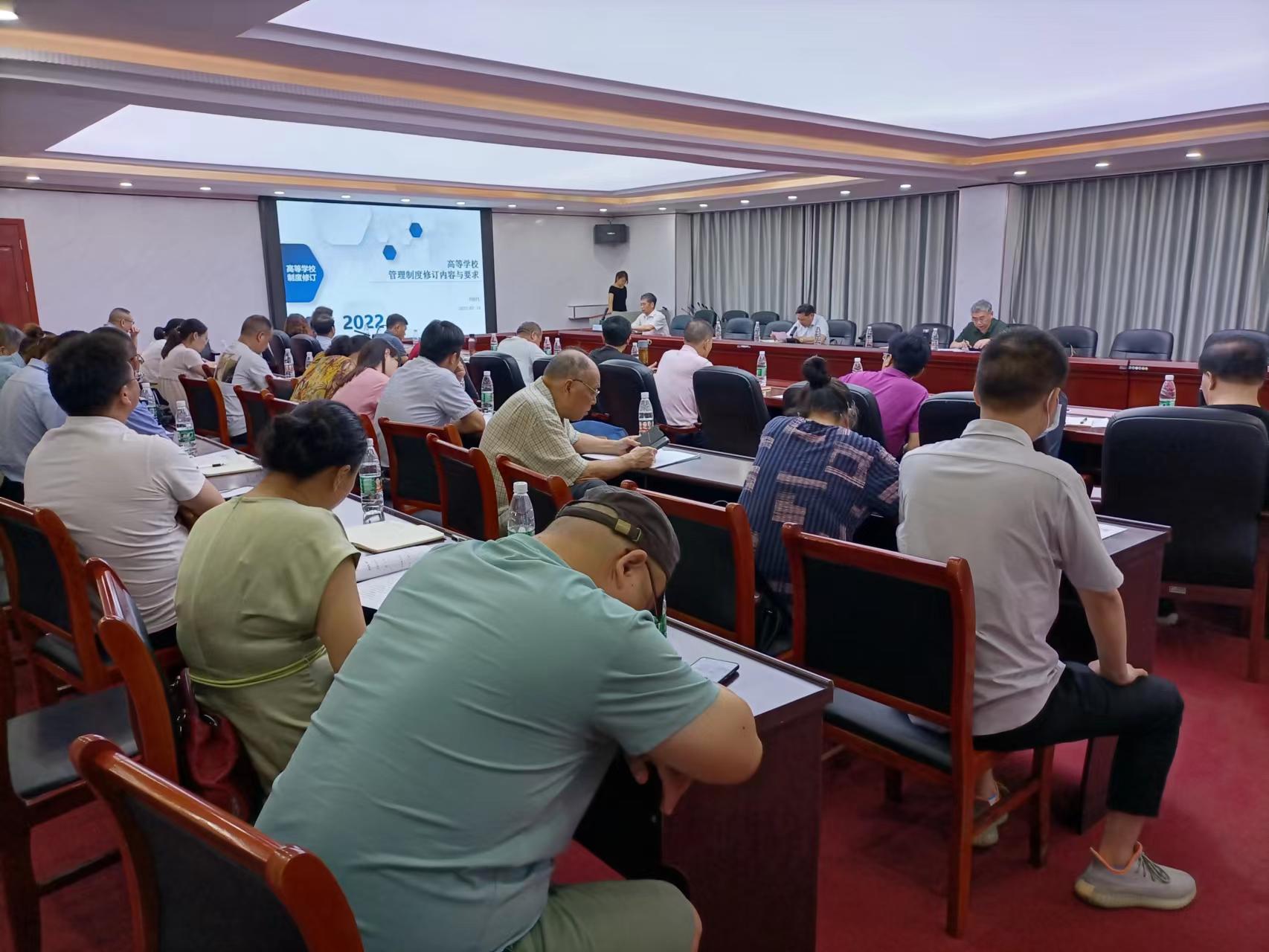 樊晓平指出,管理制度规范化建设工作是学校推进治理体系和治理能力现代化建设的重要举措,是促进学校事业健康有序发展的内在要求,也是本科教学合格评估指标体系的一项重要内容。2020年底,进行了一次规章制度的修订,有了一定的基础,总体框架基本成型。但有些制度重复、交叉,有些制度表述不够准确,有待进一步修订,牵头部门要在近期集中组织力量对文稿进行进一步的修订和完善。樊晓平要求各相关职能部门、各二级学院负责人提高认识,依法治校;高度重视本次制度汇编工作,在汇编过程中科学编排、系统把握;加强协调沟通、认真归纳梳理、注重查漏补缺。并要求办公室根据学校实际,按照突出重点、体现发展、统筹兼顾的原则认真开展征集意见、增补修订、重新校对等工作,力争把全校规章制度汇编成管理工作的“百科全书”。