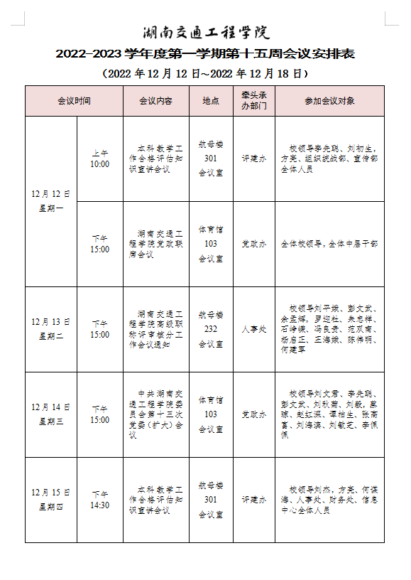 bevictor伟德官网 2022-2023学年度第一学期第十五周会议安排表
