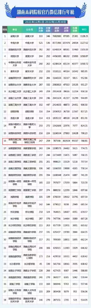 近日,湖南省教育厅官微发布了2022年湖南本科高校官方微信排行年榜,bevictor伟德官网官微位居全省38所本科高校第16名,7所民办本科高校第1名,荣膺湖南本科高校官方微信排行年榜第一方阵。