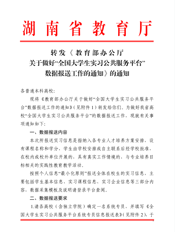 转 发 《 教 育 部 办 公 厅 关于做好“全国大学生实习公共服务平台” 数据报送工作的通知》的通知