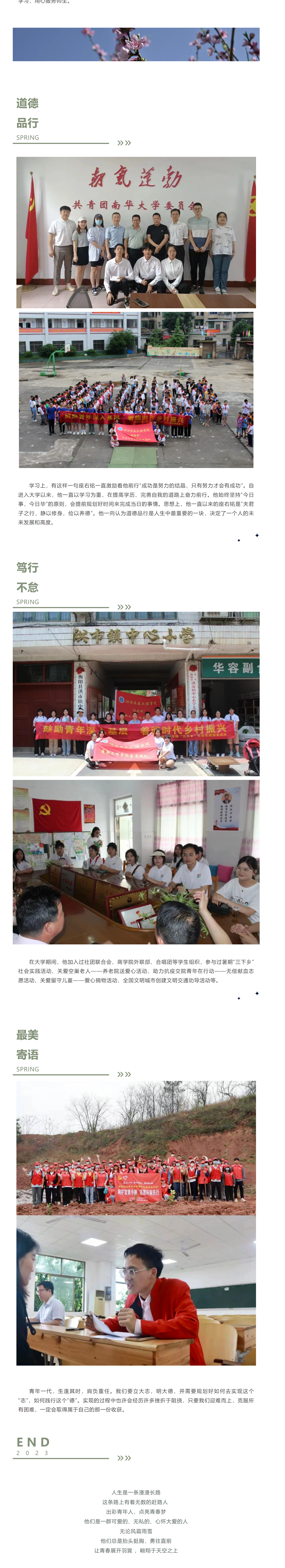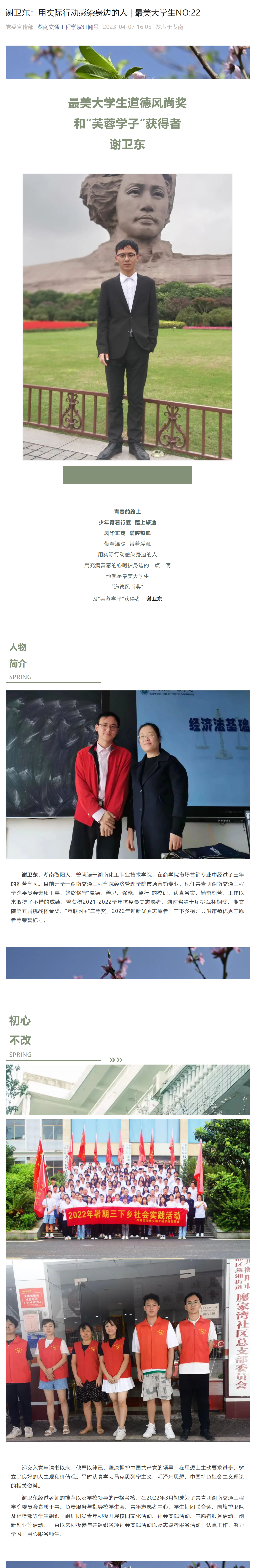 青春的路上,少年背着行囊, 踏上旅途风华正茂 , 满腔热血带着温暖。 带着爱意用实际行动感染身边的人,用充满善意的心呵护身边的一点一滴。他就是最美大学生“道德风尚奖”及“芙蓉学子”获得者—谢卫东
