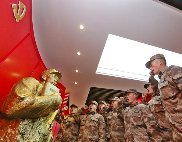 战士们面对王杰雕像庄严宣誓