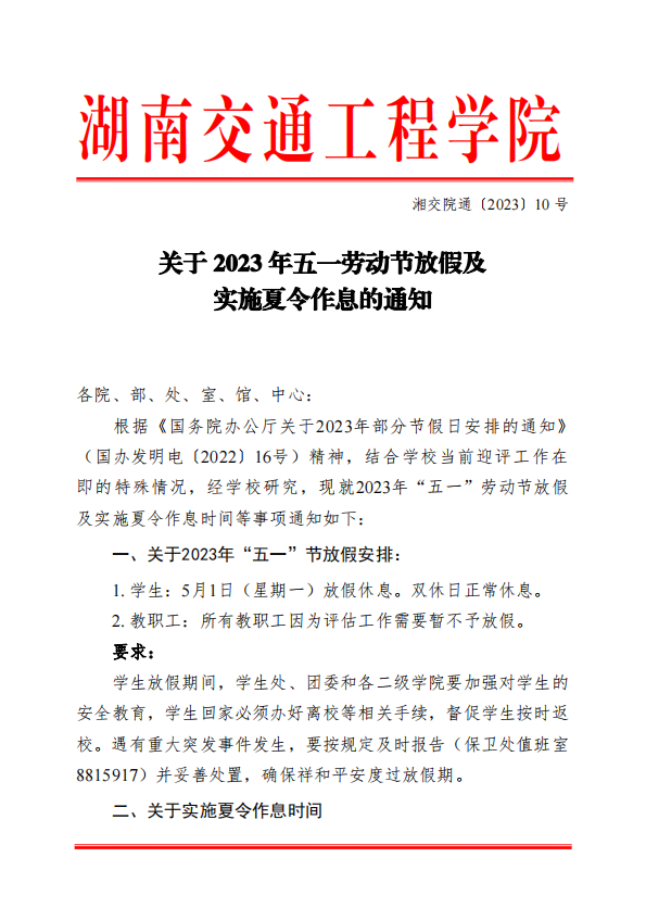 关于 2023 年五一劳动节放假及实施夏令作息的通知