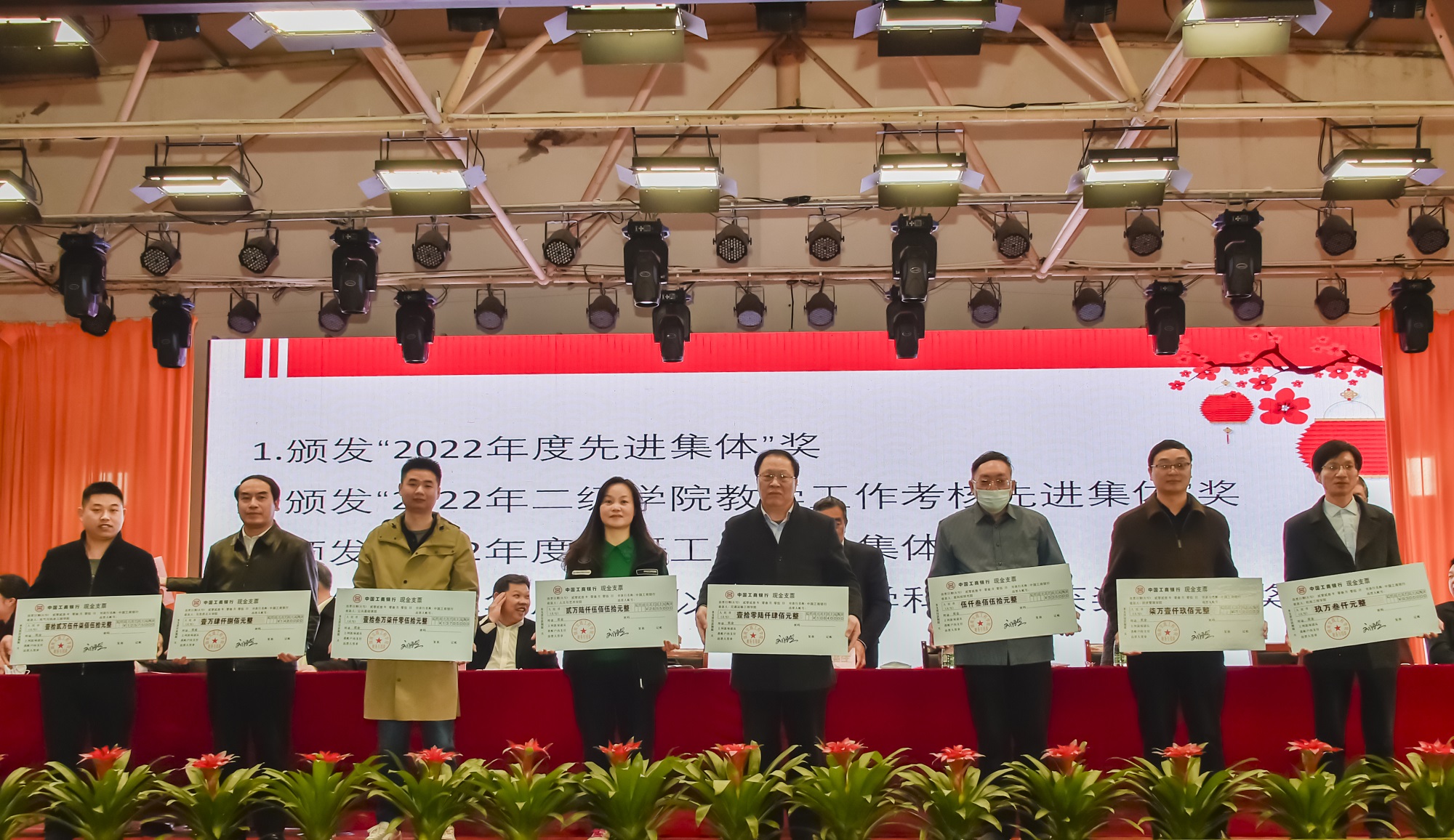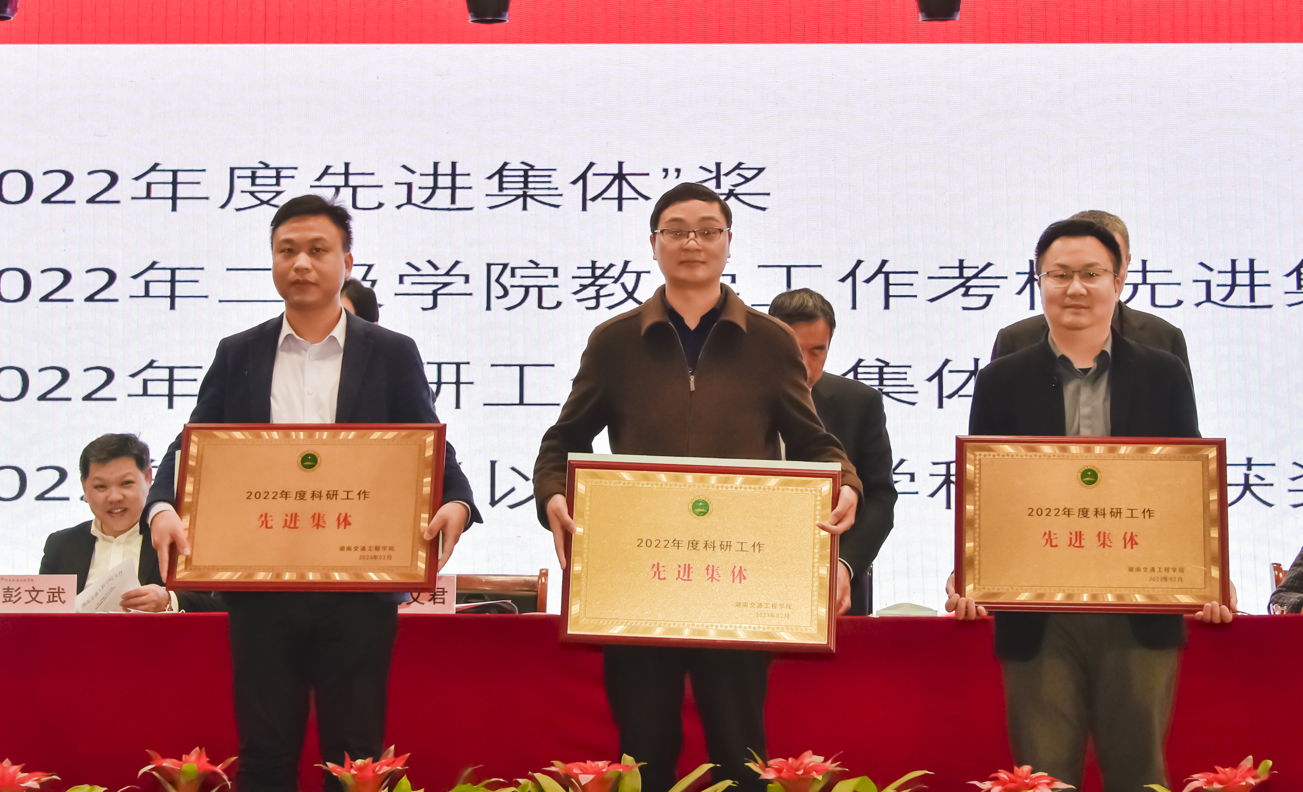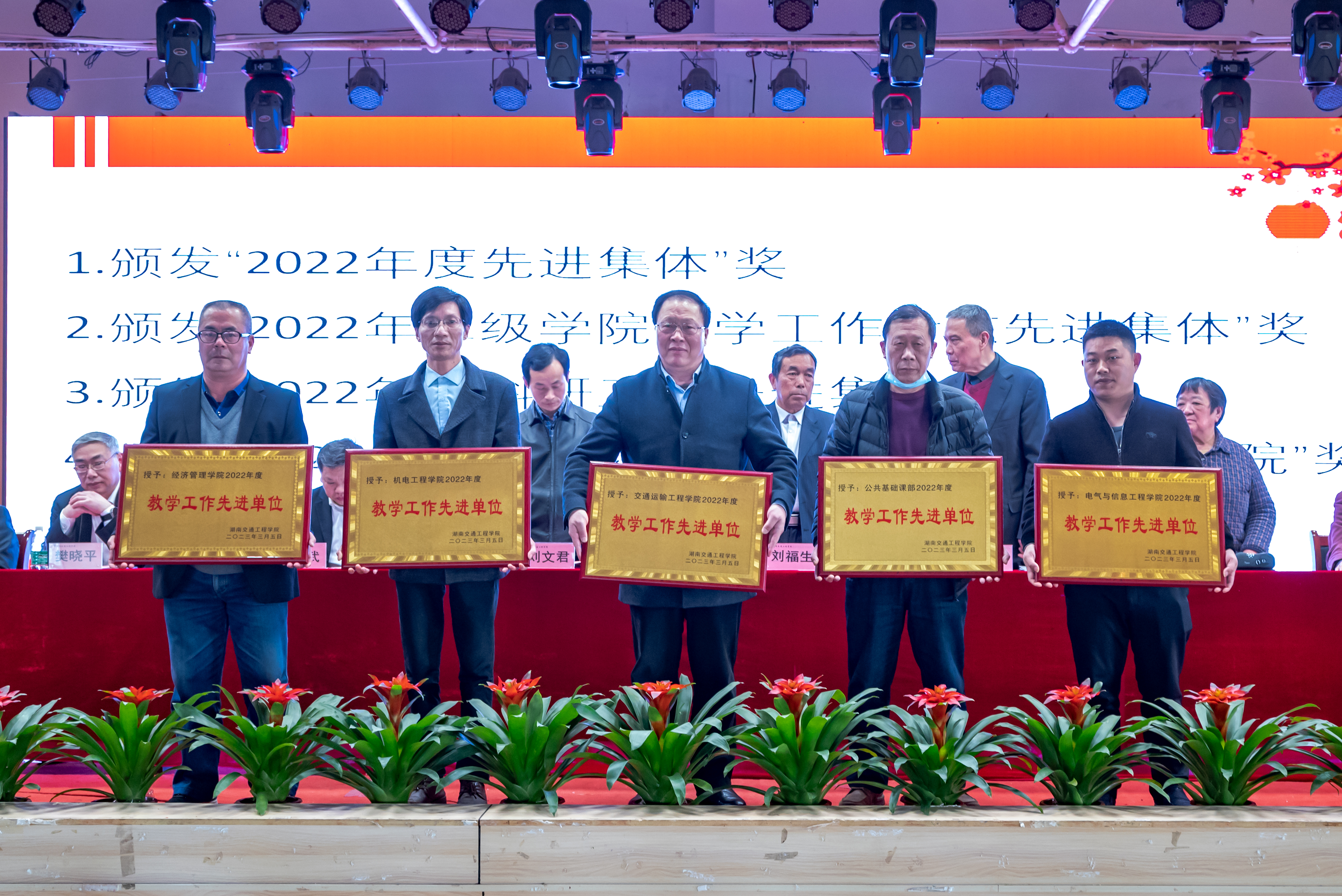 常务副校长彭文武宣读了六个表彰决定:《关于表彰 2022 年度先进集体、先进个人的决定》《2022年二级学院教学工作考核结果与奖励决定》《2022年教师教学科研业绩工作考核结果通报》《关于表彰2022年度科研工作先进集体、先进个人及优秀科研管理工作者的决定》《关于表彰2022年度省级以上学科竞赛获奖者的决定》《关于表彰 2022 年度省级教学比赛获奖者的决定》。