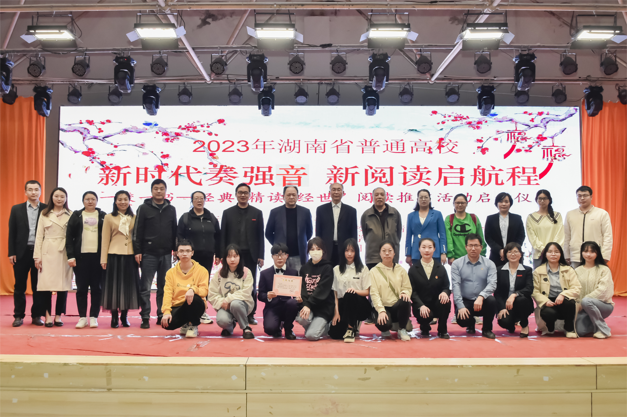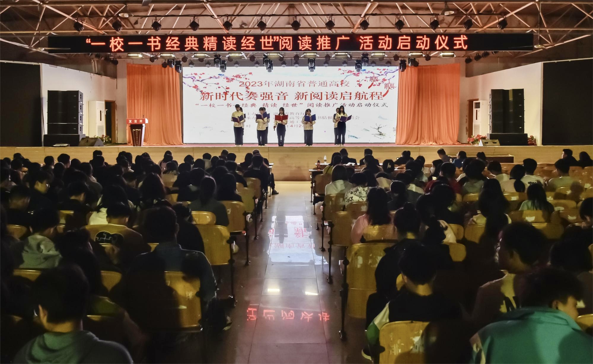 本网讯(记者 赵红深 摄影 李建华)根据湖南省教育厅《关于做好2023年全省普通本科高校“一校一书——经典、精读、经世”阅读推广活动的通知》要求,bevictor伟德2023年“一校一书——经典、精读、经世”阅读推广活动已于4月正式启动。4月27日晚,学校在大学生活动中心举行2023年“一校一书”阅读推广活动启动仪式,党委副书记李先聪到会并致辞,副校长余孟辉宣读学校2022年“一校一书”阅读推广活动表彰文件。各二级学院党总支书记、副书记、学生支部书记,党务部门负责人,图书馆全体成员,全体辅导员,团学干部代表、优秀学生代表近2000人参加活动。校团委书记漆在林主持。