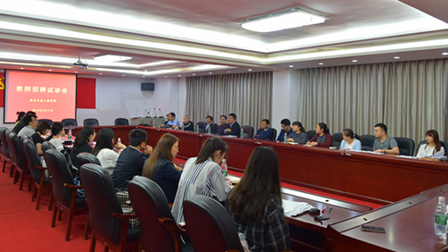 刘杰代表学校对28位前来应聘试教人员表示热烈欢迎,并亲临现场对应聘者进行试讲点评与指导。人事处主管人才引进的谭园玲老师介绍了本次招聘会的流程和有关事项。招聘流程按简历筛选、试讲、拟聘面谈、签约等程序进行,按专业分理工组、人文管理组、艺术组进行试讲。