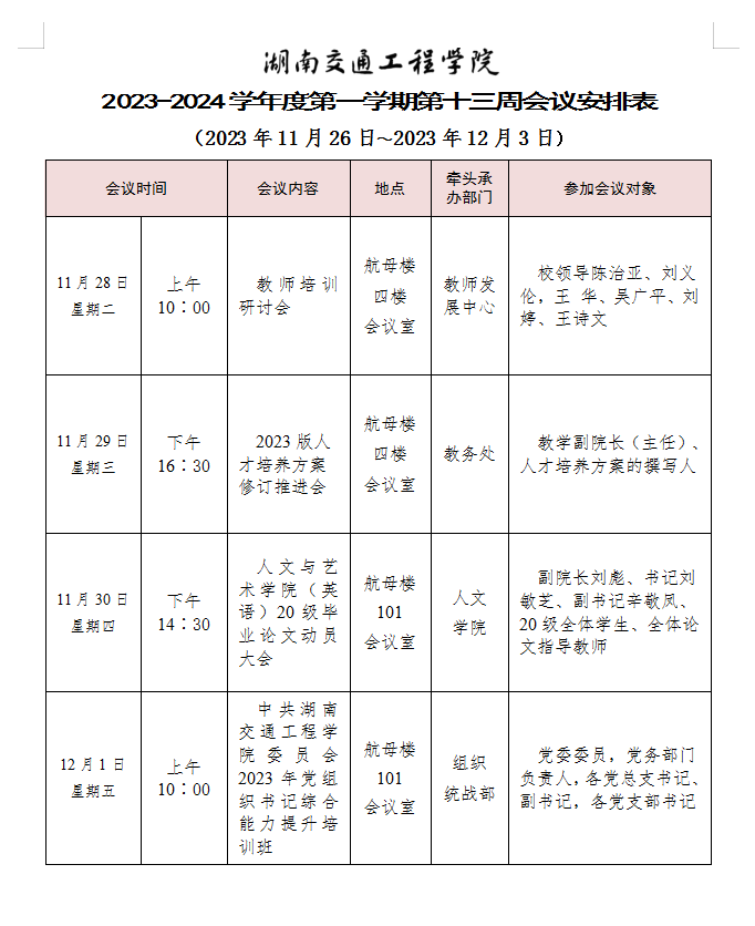 bevictor伟德官网 2023-2024学年度第一学期第十四周会议安排表