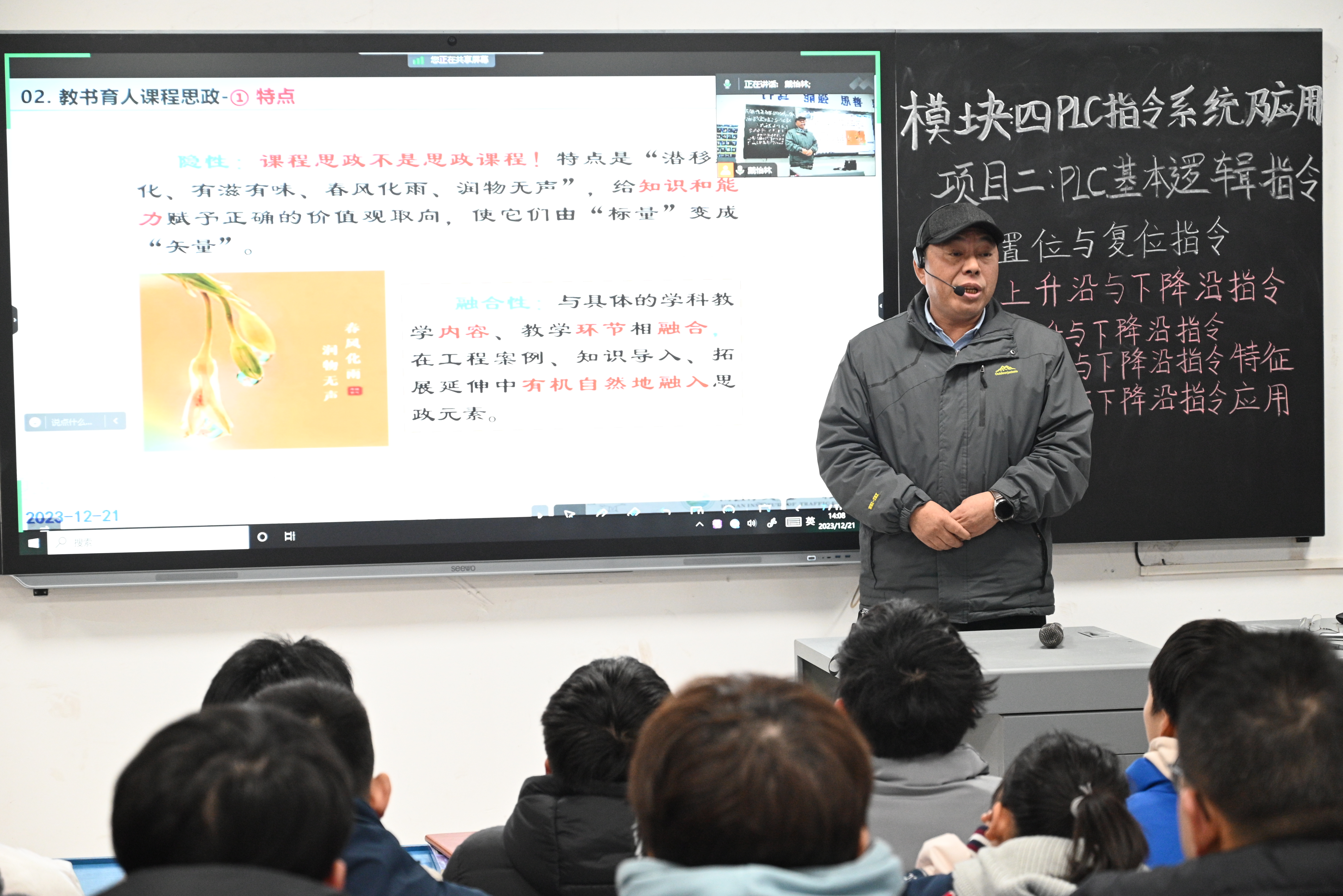 此次活动由教务处主办,教务处副处长王海娥主持。设备处处长陈伟明教授以“创新教学背景下,着力提升教学技能”“电气控制与PLC应用技术”两个课件进行了教学示范。他从“创新教学时代背景,教书育人课程思政,数字赋能课程教学,以学生为中心”等四个方面,通过信息化教学平台和PPT相结合的方式,对具体课程教学中实际运用的信息化教学设计、教学手段和实施成效等进行了展示。