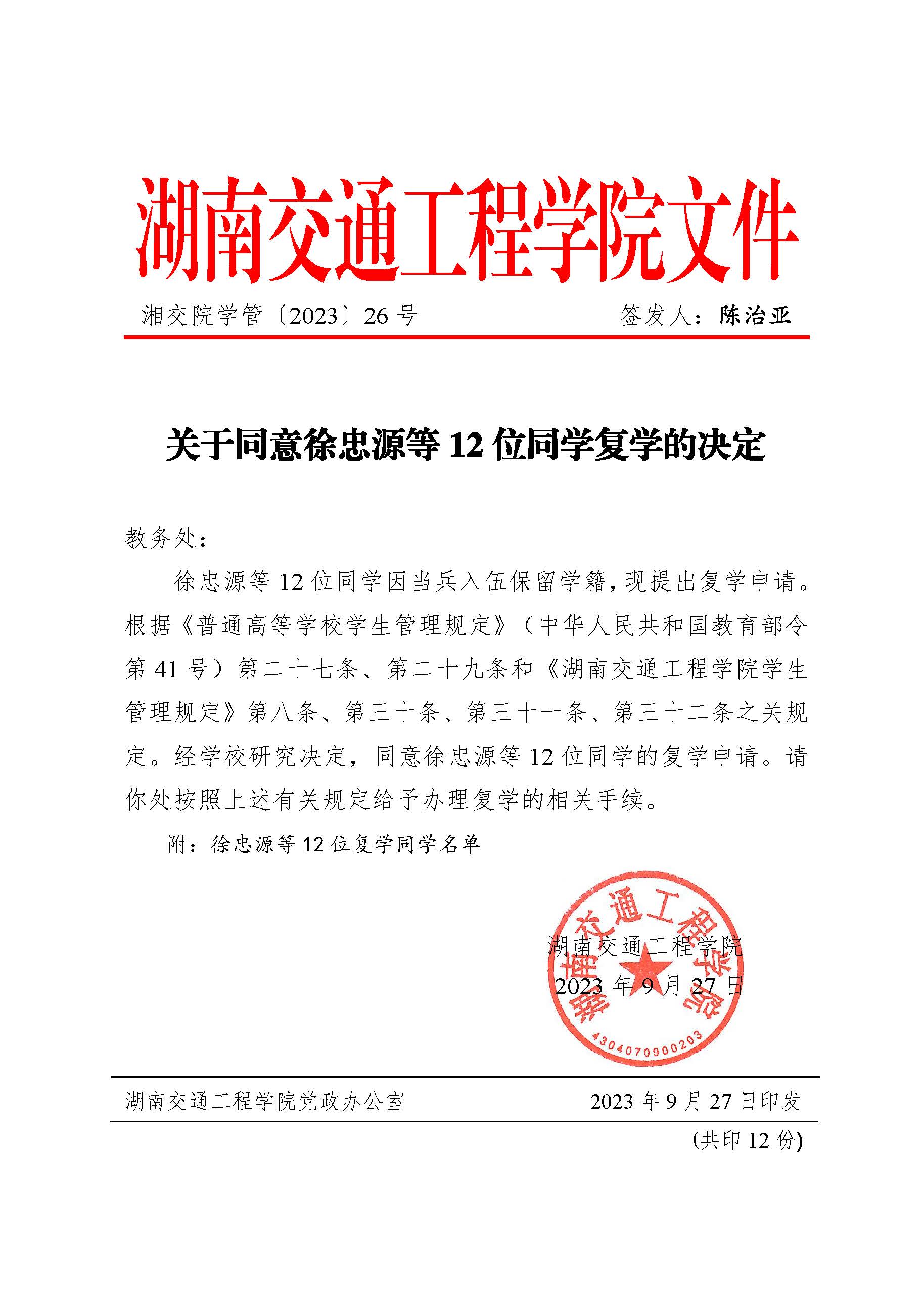 关于同意徐忠源等12位同学复学的决定(湘交院学管〔2023〕26号)