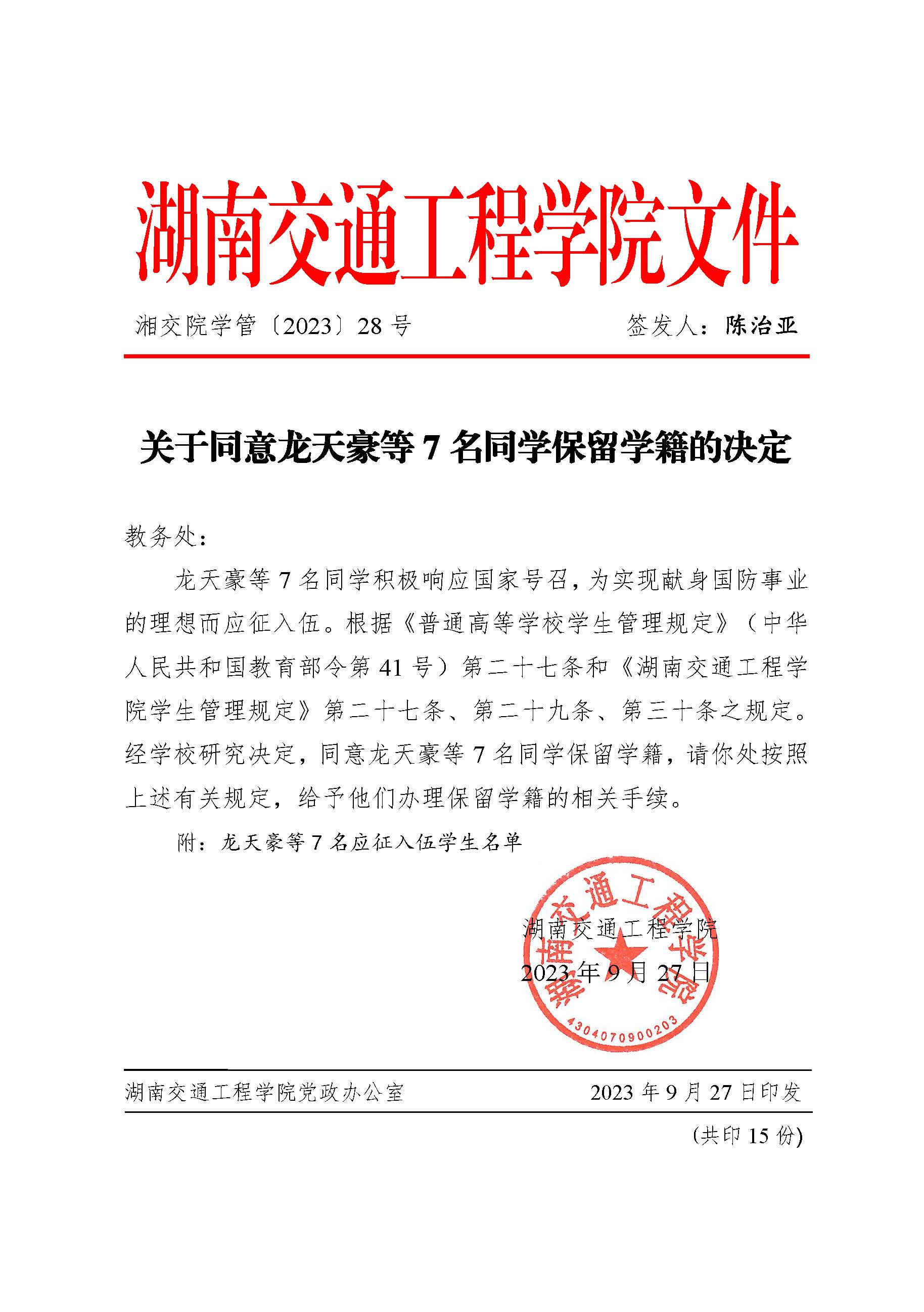 关于同意龙天豪等7名同学保留学籍的决定(湘交院学管〔2023〕28号)