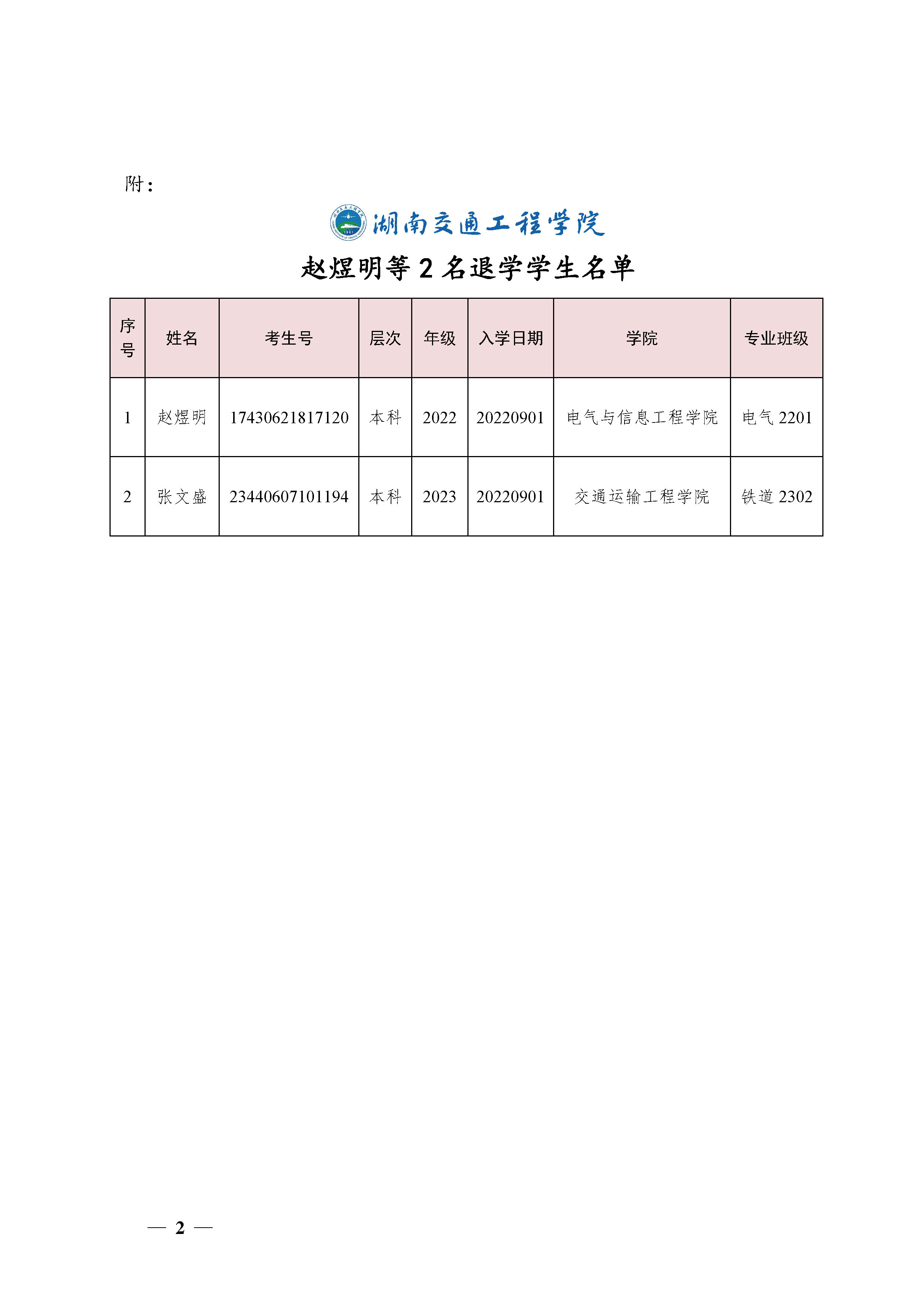 关于同意赵煜明等2位同学退学的决定(湘交院学管〔2023〕40号)