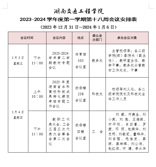 bevictor伟德官网2023-2024学年度第一学期第十七周会议安排表
