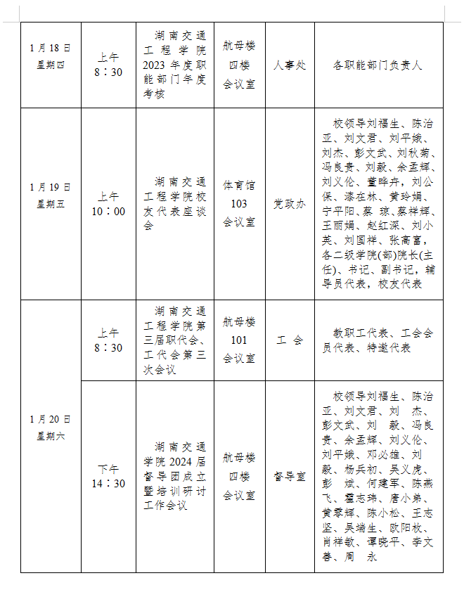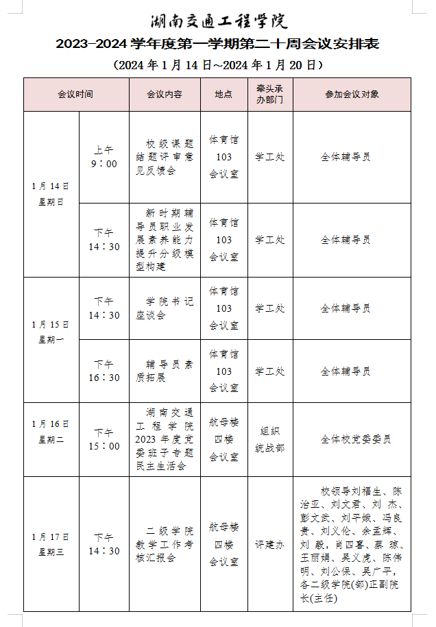 bevictor伟德官网2023-2024学年度第一学期第十九周会议安排表