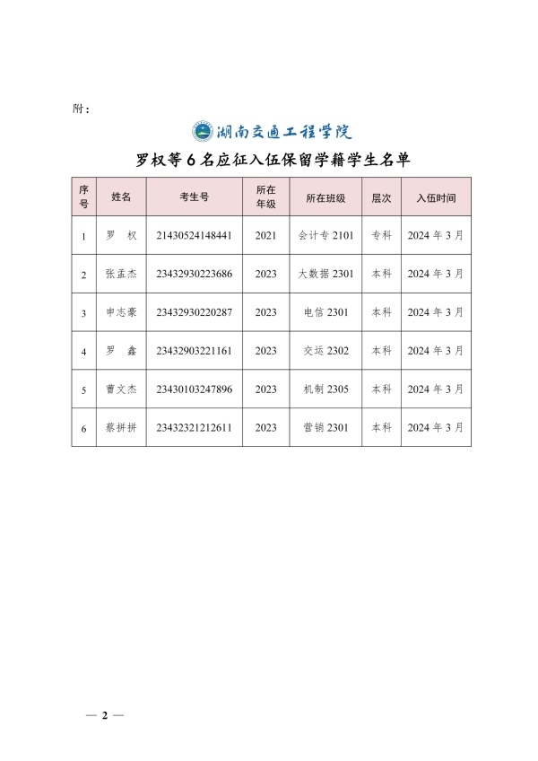 关于同意罗权等6名同学保留学籍的决定(湘交院学管〔2024〕10号)