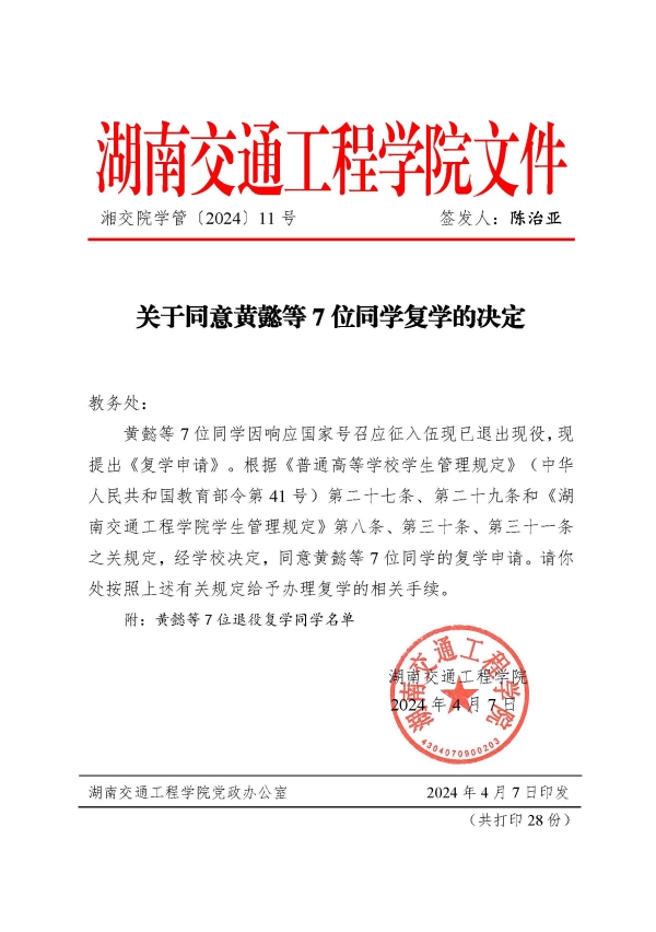 关于同意黄懿等7位同学复学的决定(湘交院学管〔2024〕11号)