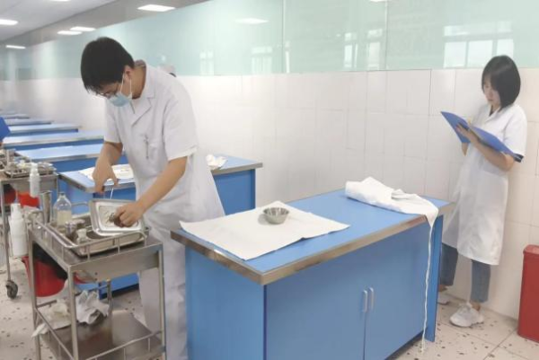 宣誓结束,参赛选手进行抽签考试,比赛正式开始。此次比赛分为两个操作项目:无菌操作和铺备用床。赛场上,选手们沉着冷静、应对自如,操作紧密流畅,以娴熟的技能、敏捷的应变能力及良好的心理素质展现了医护学子积极进取的精神风貌。评委们认真观察每一个细节,予以客观公正的评分。