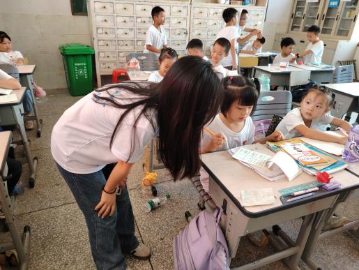 乡村振兴团队员与当地村支书和湖南师范大学团队辅导中心负责人进行了交流,了解到小朋友们在假期的学习生活。随后,乡村振兴团成员依托特色课程,关注孩童成长的个性需求,创新教学方法,精心备课、认真试课,营造趣味性氛围,为孩子们带来了一节节“阳光”课堂,课程包括手工、应用逻辑、绘制思维导图及辅导小朋友们完成暑期作业,为他们答疑解惑。为了调动孩子们的积极性,课堂中老师加入了抢答和游戏环节,在嬉戏与欢笑中,在亲切与友爱间,这一个个小游戏拉近了同学与孩子们之间的距离。