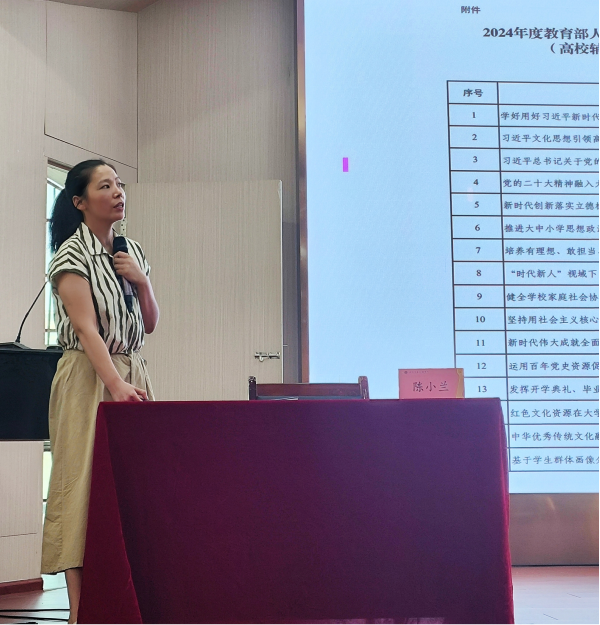 2024年暑期辅导员素质能力提升培训采取专家报告辅导、红色教育基地研学、分学院主题研讨的方式进行。8月24日上午,南华大学学工部/武装部副部长、学生心理健康教育中心主任郑宇、南华大学护理学院学工办主任、党支部书记陈小兰分别以“初心健心两不忘·幸福快乐交工人”、“铸魂筑梦·助力“研”途—关于辅导员开展思政研究的思考和体会”为题给辅导员做主题报告。