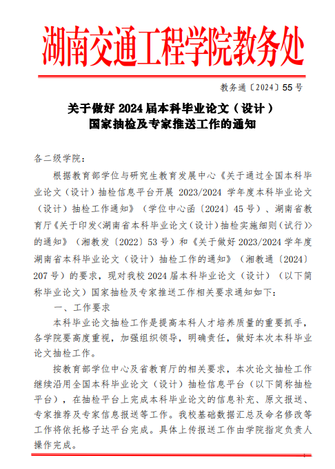 关于做好 2024 届本科毕业论文(设计) 国家抽检及专家推送工作的通知