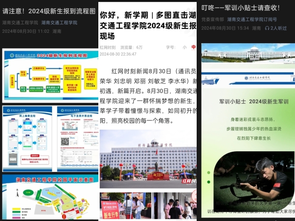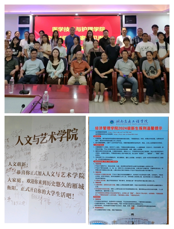 专属祝福,朋辈“情”传递。各班级辅导员送给新生一张“见面礼”,将辅导员个人信息和安全基本常识如防推销、防诈骗、防溺水等设计在一张卡片,引领新生快速熟悉校园学生,适应大学生活。大学生记者团和校团委为新生设立了迎新背景墙和创意打卡点,为新生和家长提供一个创意留影。宣传部为新生做了“请注意,2024级新生报到流程”“叮咚,军训小贴士请查收”“湘交院,我来啦,多图直击2024级新生报到现场”等系列迎新推文,为新生尽快熟悉校园提供方便。各学院突出特色、“花式”迎新,医护学院举行2024级新生家长见面会,为学生和家长全面介绍学校和学院的情况,共绘成长蓝图,架起家校连心桥。经管学院精心制作的“新生报到温馨提示”与“交院启航激扬青春、厚德善思不负华年”的寄语交相呼应,寄托着对新生们求学之路的期待和祝福。人文与艺术学院为新生准备了名为“扬帆远航”的纪念贺卡,寓意新生在新的征途中扬帆起航,奋勇向前。交通运输学院的特色社区新生报到点、机电工程学院的独具“匠”心的新生“专属名牌”、电气与信息学院的新生生涯规划手册和新生签名墙……各种独具二级学院特色的迎新活动精彩纷呈,以满满的仪式感为全体新生开启逐梦新征程。