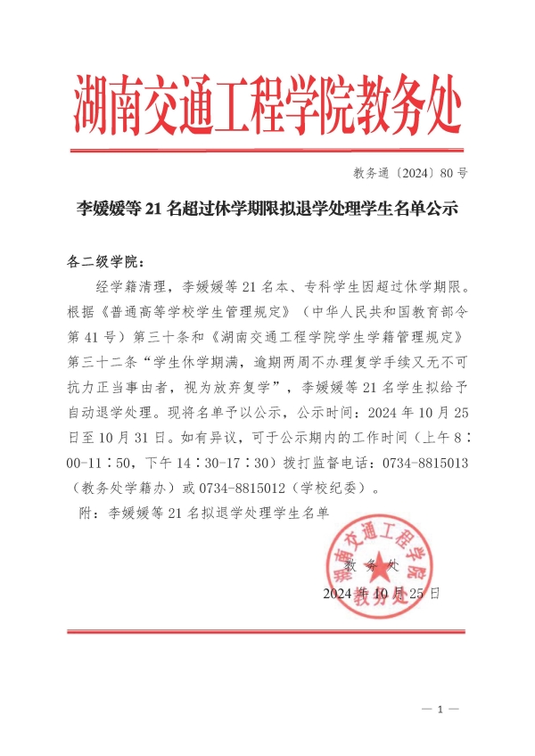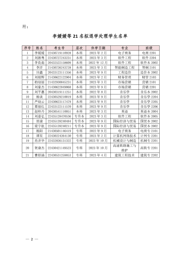 转教务处:李媛媛等21名超过休学期限拟退学处理学生名单公示