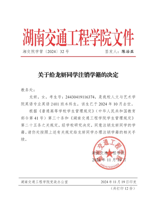 关于给龙妍同学注销学籍的决定(湘交院学管〔2024〕32号)