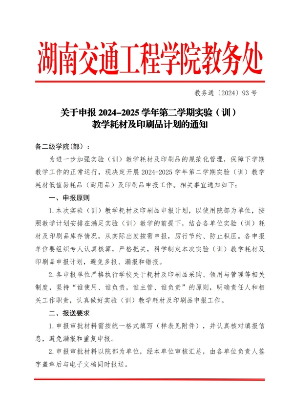 关于申报2024-2025学年第二学期实验(训)教学耗材及印刷品计划的通知