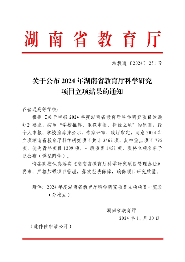 关于公布2024年湖南省教育厅科学研究项目立项结果的通知