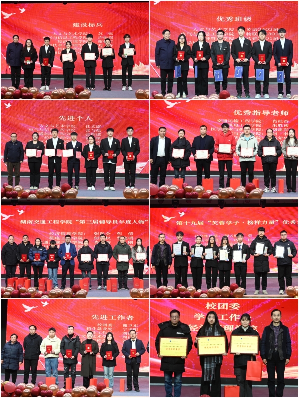 副校长余孟辉宣读4个表彰决定: 《第十九届“芙蓉学子·榜样力量”优秀大学生》《2024年大学生暑期返家乡社会实践活动》《“共创文明校园,共建优良学风”主题教育实践活动》《bevictor伟德官网第三届辅导员年度人物》。校领导分批次为获奖集体和个人颁奖。