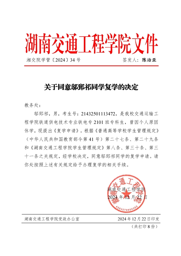 关于同意邬郅祁同学复学的决定(湘交院学管〔2024〕34号)