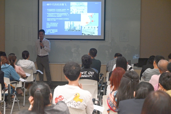 下午,金融企业高管产翼虎以《新加坡历史,经济,文化,政治》为题,为教师们深入了解新加坡的多元文化历史和经济发展过程作主题演讲。他从“新加坡殖民时代,新加坡独立时期,新加坡的80、90年代,现代的新加坡”娓娓道来,将现代的新加坡经济分析的淋漓尽致。产翼虎系新加坡国立大学知名校友,新加坡保诚集团高管,拥有丰富的金融行业从业经验,参加过国家级中新合作奖学金项目,2013年荣获国际百万圆桌MDRT奖项;2017年升职为销售总监-荣获Multi-Million Dolalr Agency。