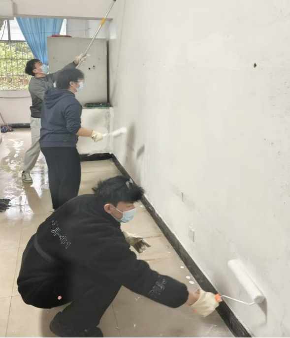 在校园温馨一角,辅导员楼栋长们化身“粉刷匠”,走进宿舍党员活动室,开启“焕新”之旅,副校长余孟辉也亲临现场。