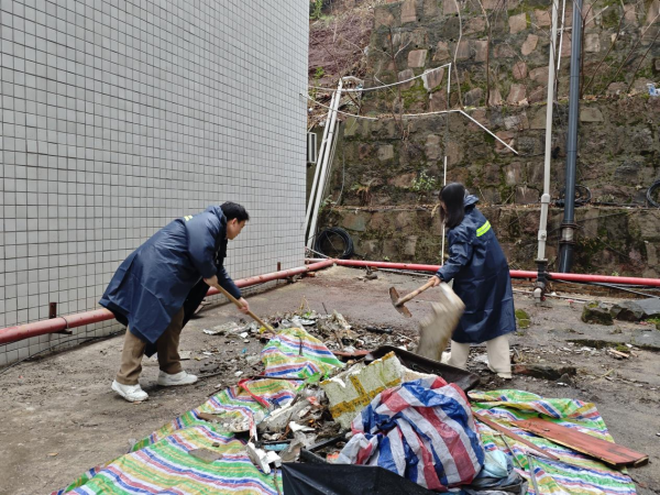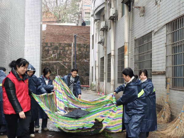 全体党员准时到达教学楼102教室集合,领取清洁工具,划分的责任区域,迅速投入到清洁工作中。大家分工协作,党总支书记邓丽和辅导员罗朝扬老师带队清理路面杂物,党总支副书记刘建军带队搬书以及清洗斑马线,干事老师陈文蓉带队清理教学楼走廊地板的口香糖。尽管天气寒冷,下着小雨,但大家热情高涨,干劲十足,充分展现了共产党员不怕脏、不怕累的优良作风。