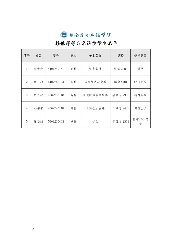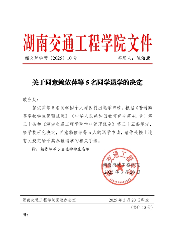 关于同意赖依萍等5名同学退学的决定(湘交院学管〔2025〕10号)