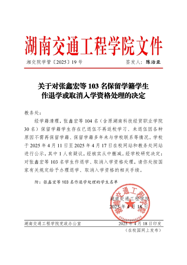 关于对张鑫宏等103名保留学籍学生作退学或取消入学资格处理的决定(湘交院学管〔2025〕19号)