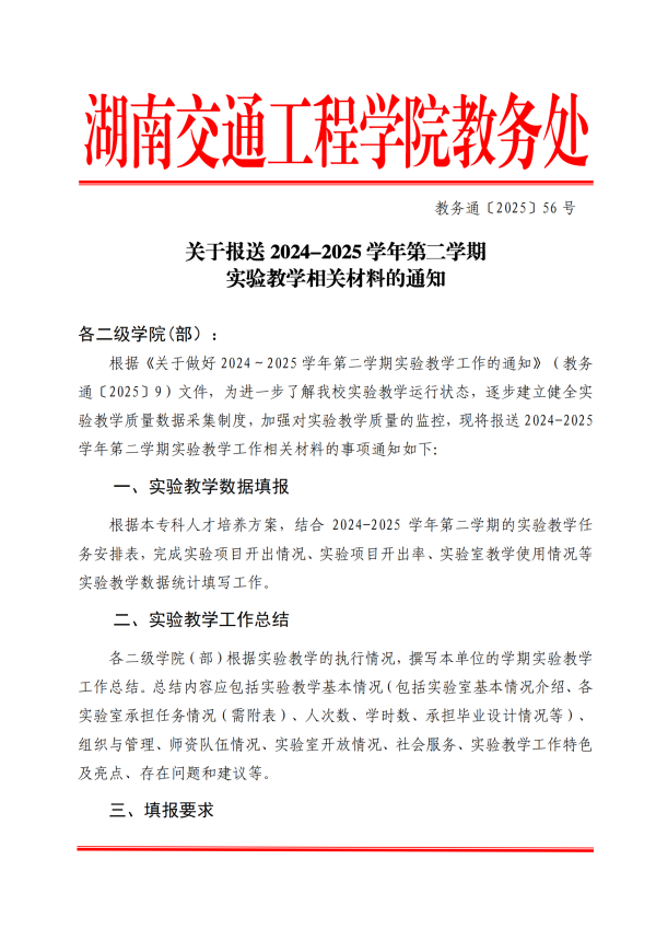关于报送2024-2025学年第二学期实验教学相关材料的通知